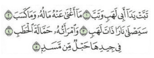 “Binasalah kedua tangan Abu Lahab, dan sesungguhnya dia akan binasa. Tidak berguna baginya hartanya dan apa yang telah diusahakannya. Kelak dia akan masuk ke dalam api yang menyala-nyala. Dan (begitu pula) istrinya, pembawa kayu bakar. Di lehernya ada tali dari sabut yang dipintal.”
